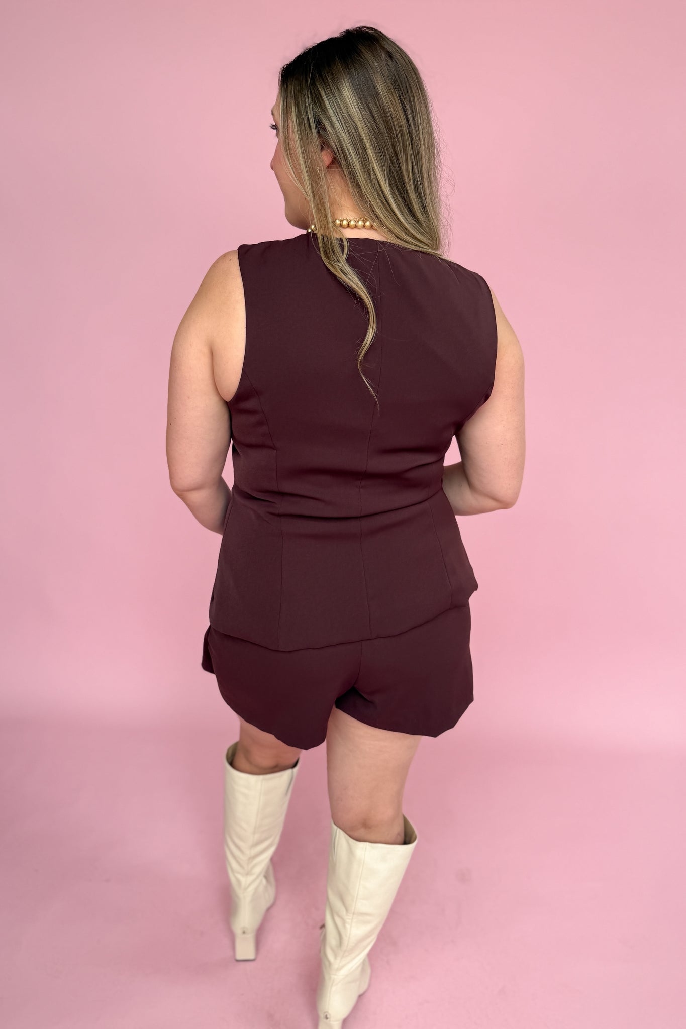 Embrace effortless style with this playful chocolate brown romper. Featuring a solid sleeveless design and a round neck, it’s perfect for warm days. The gold rim accent button closure adds a touch of sparkle, while the concealed side zipper keeps the look sleek. Lightweight and lined for comfort, this woven piece is non-sheer and ready to brighten your wardrobe with easy elegance.
