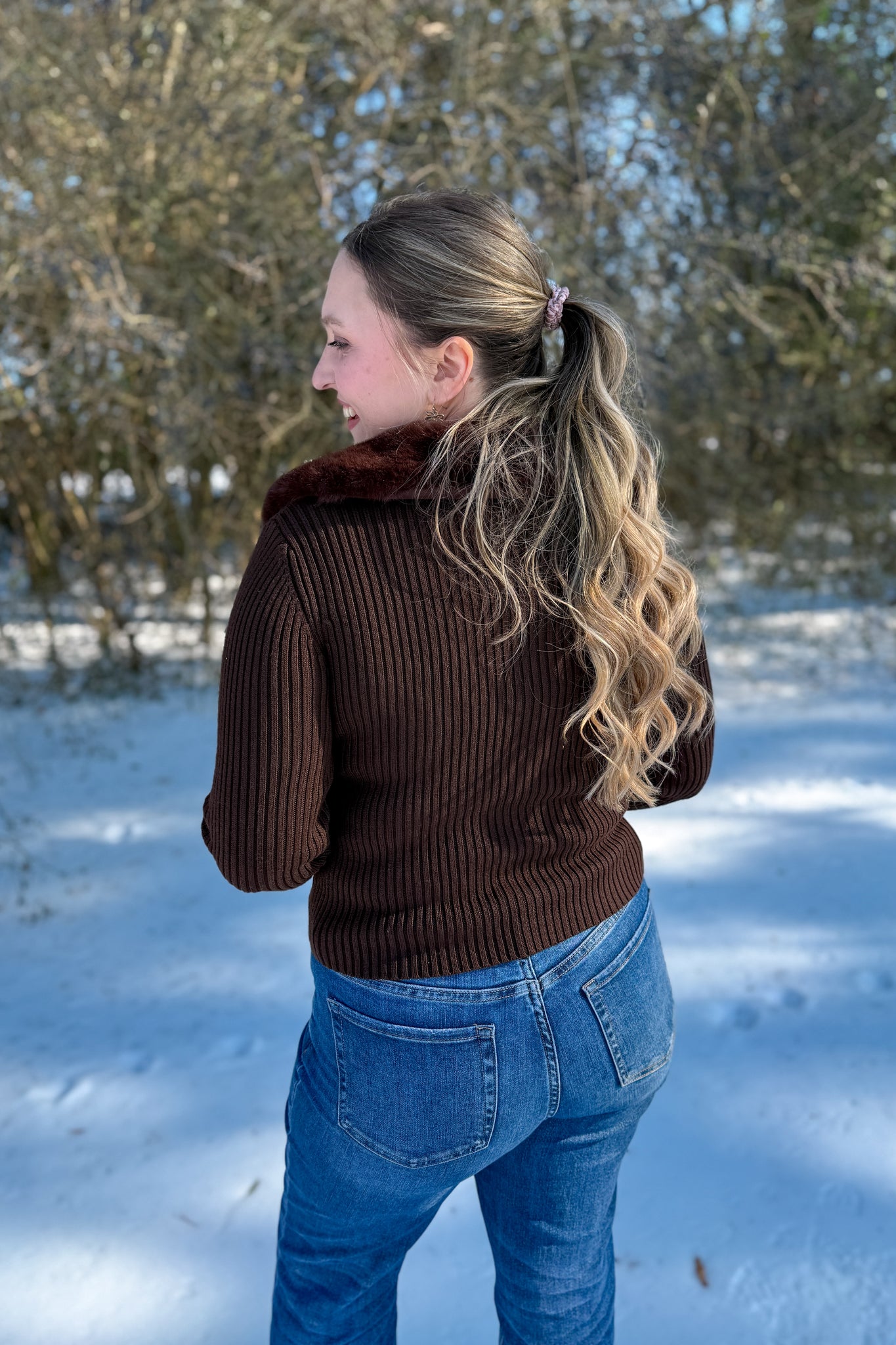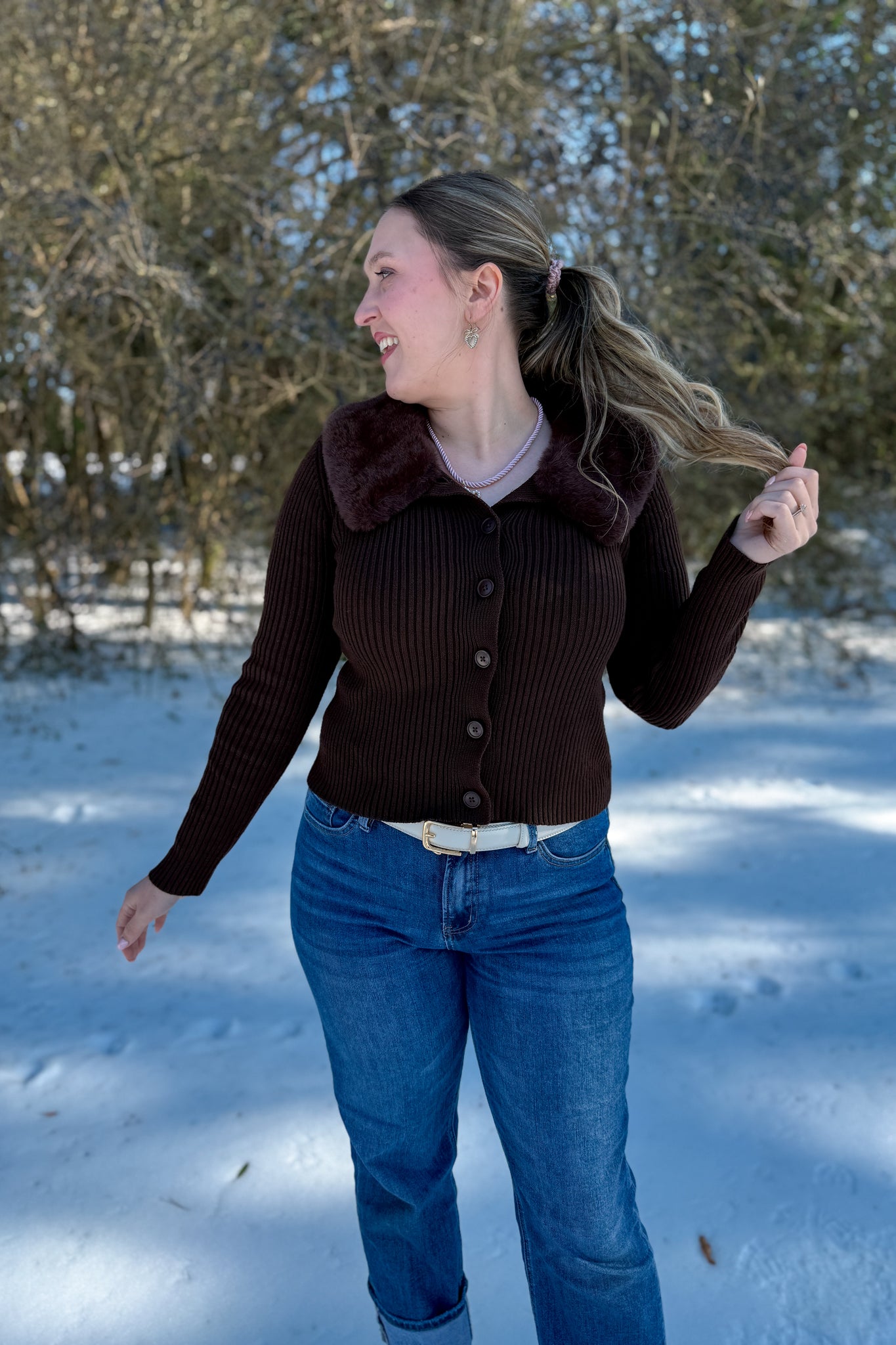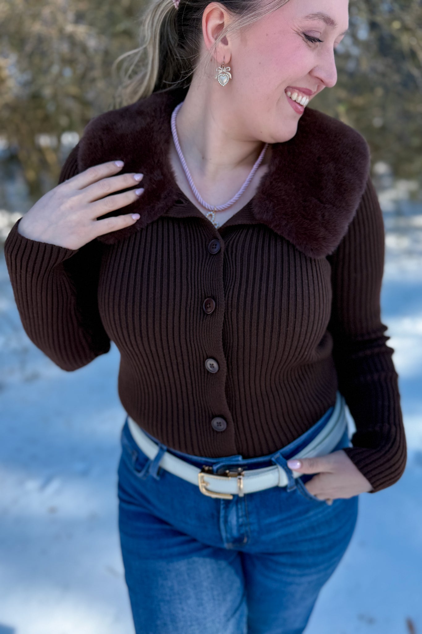 Brown Faux Fur Cardigan with brown buttons and removable faux fur. Perfect for a cozy mountain getaway.