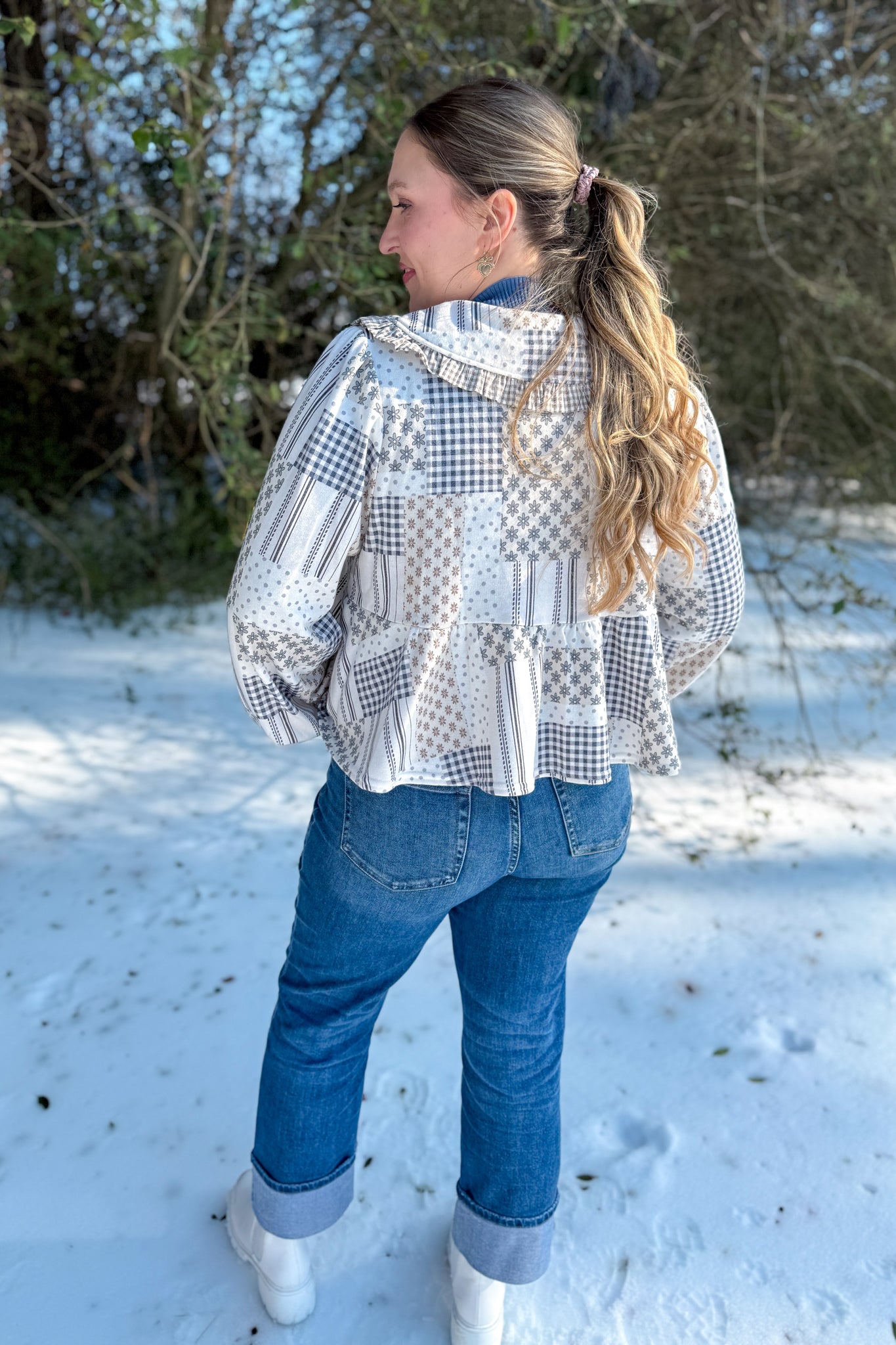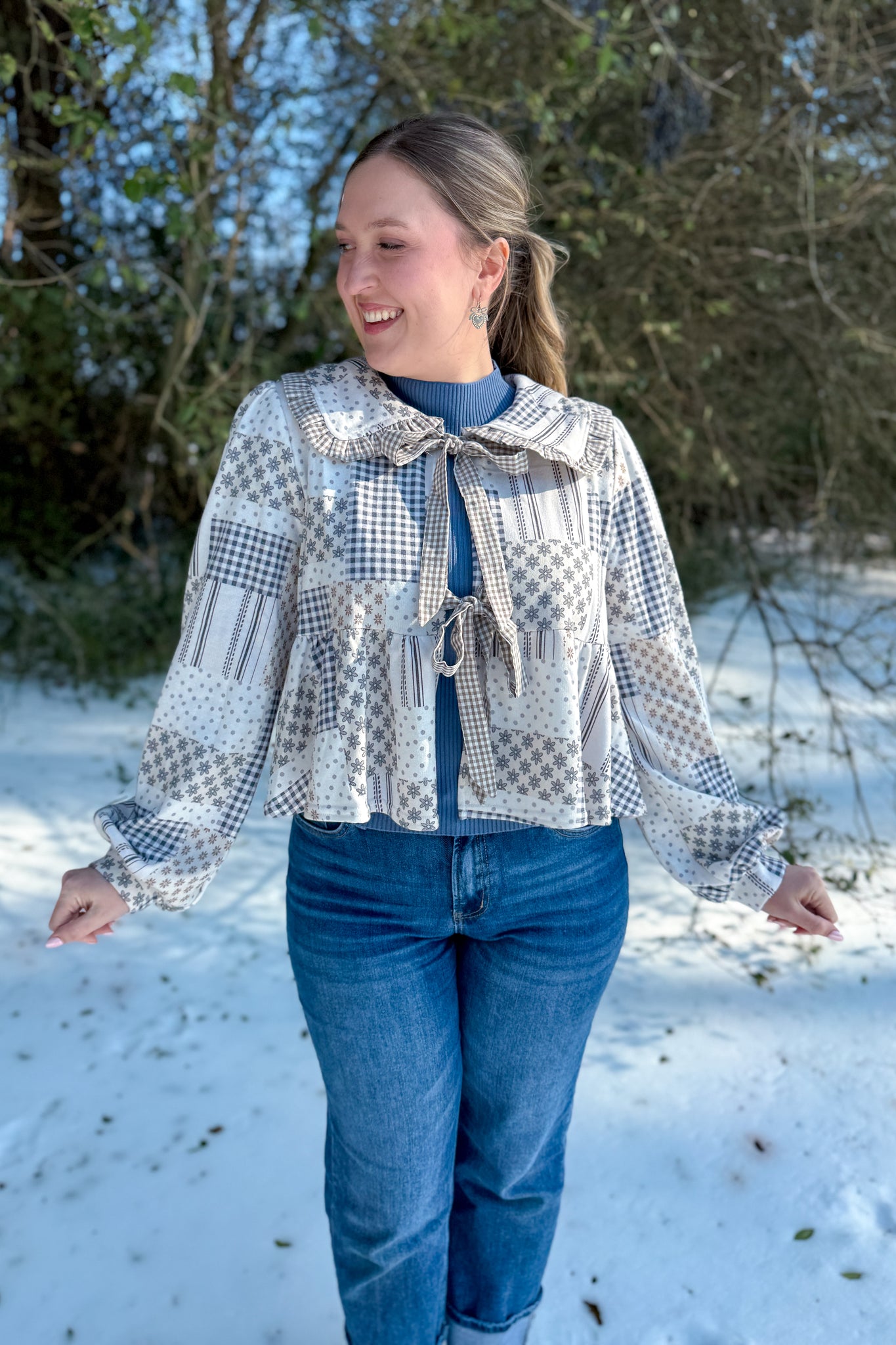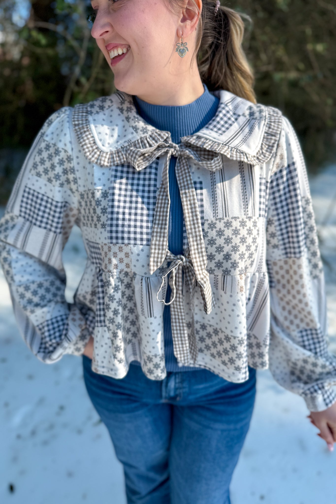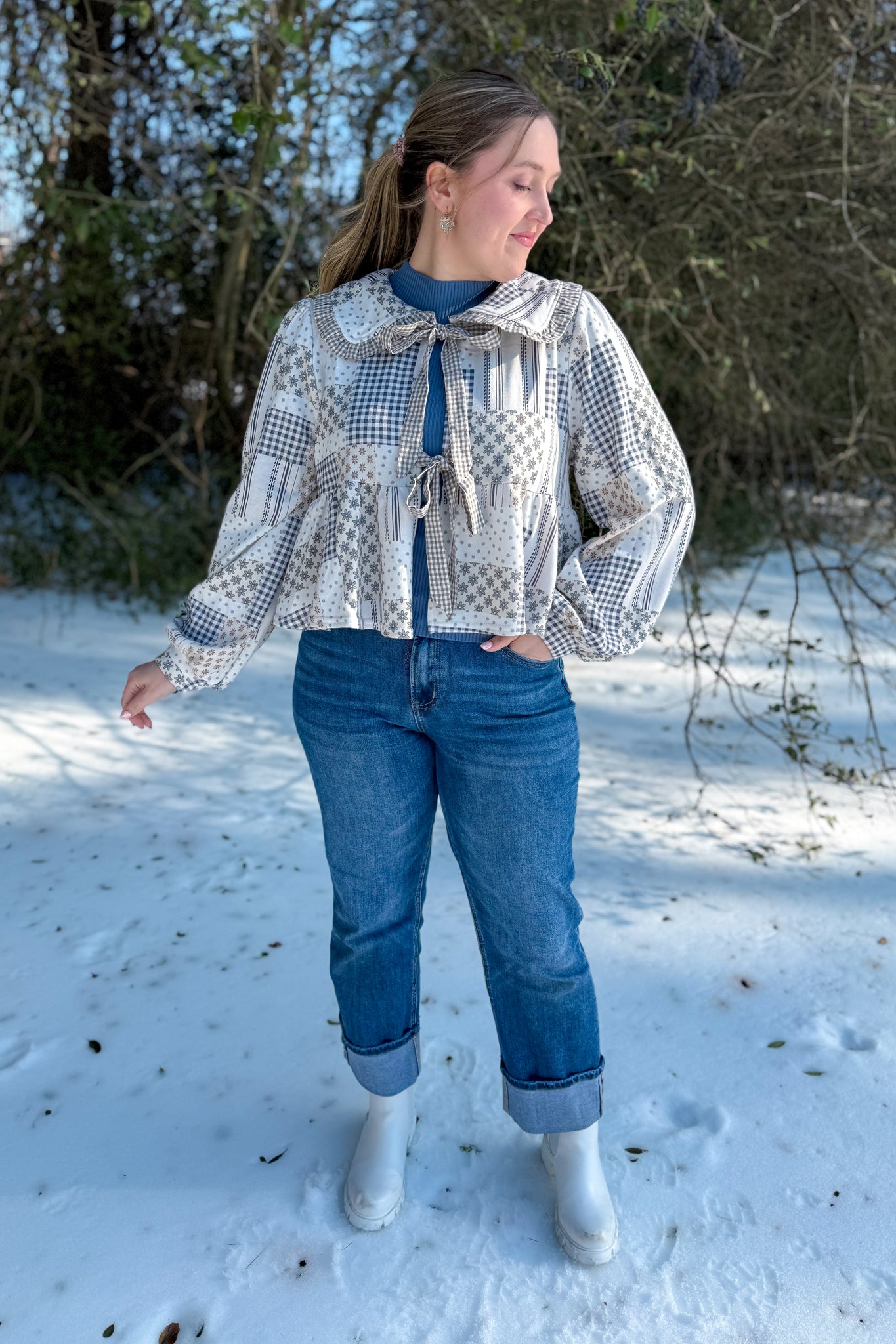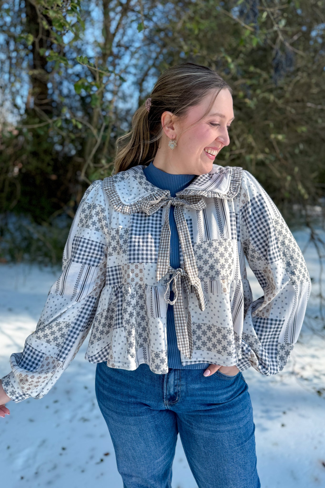 The Leann Top is your go-to piece for effortless style with serious personality. Crafted from 100% cotton, this slightly cropped beauty features an eye-catching allover patchwork print mixing stripes and florals in rich navy tones. The signature peter pan collar with delicate ruffle trim and double bow closure delivers vintage-inspired charm, while voluminous balloon sleeves and a playful peplum silhouette keep things fresh and modern. Perfect for adding a spirited edge to your everyday rotation.