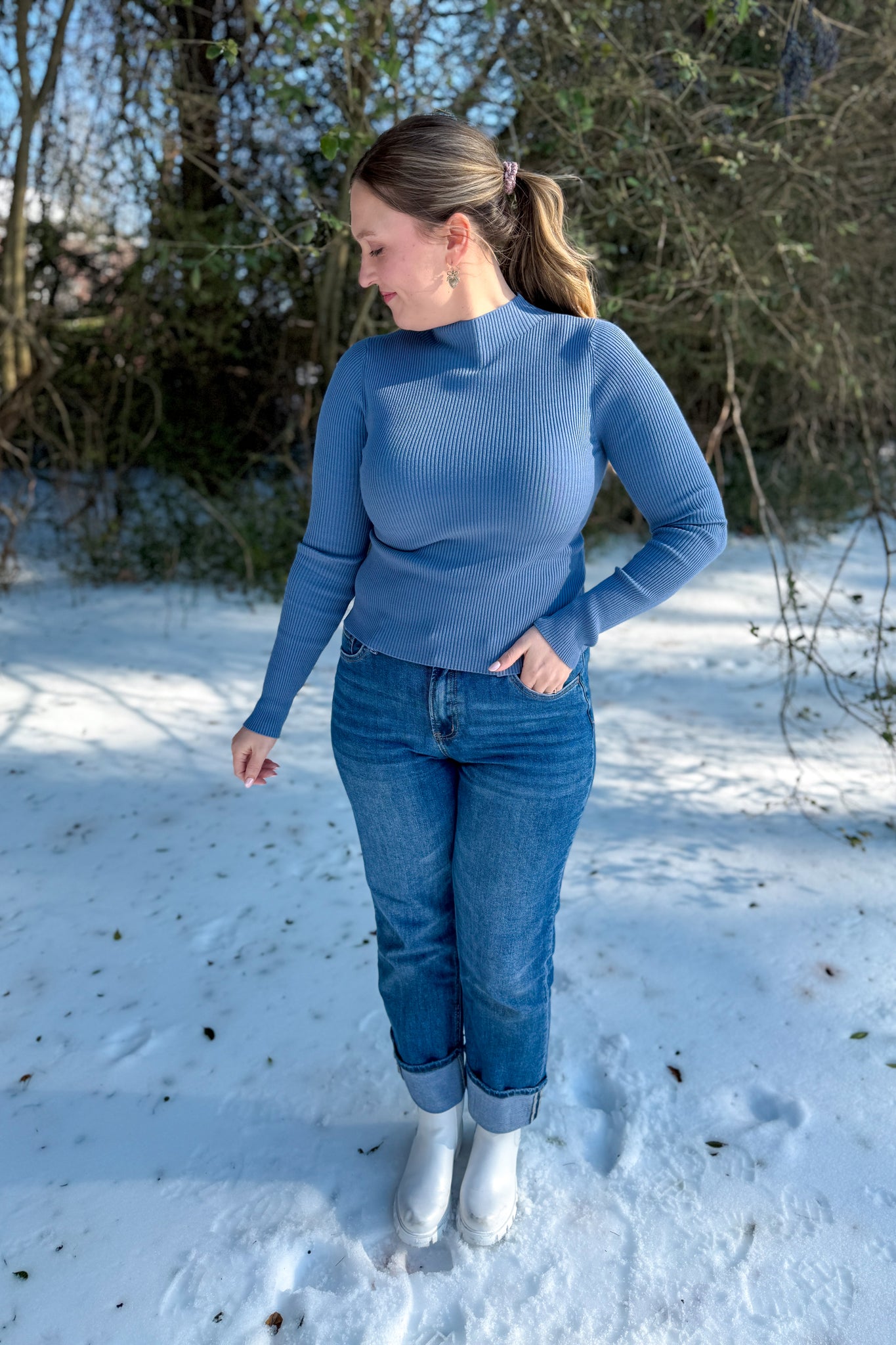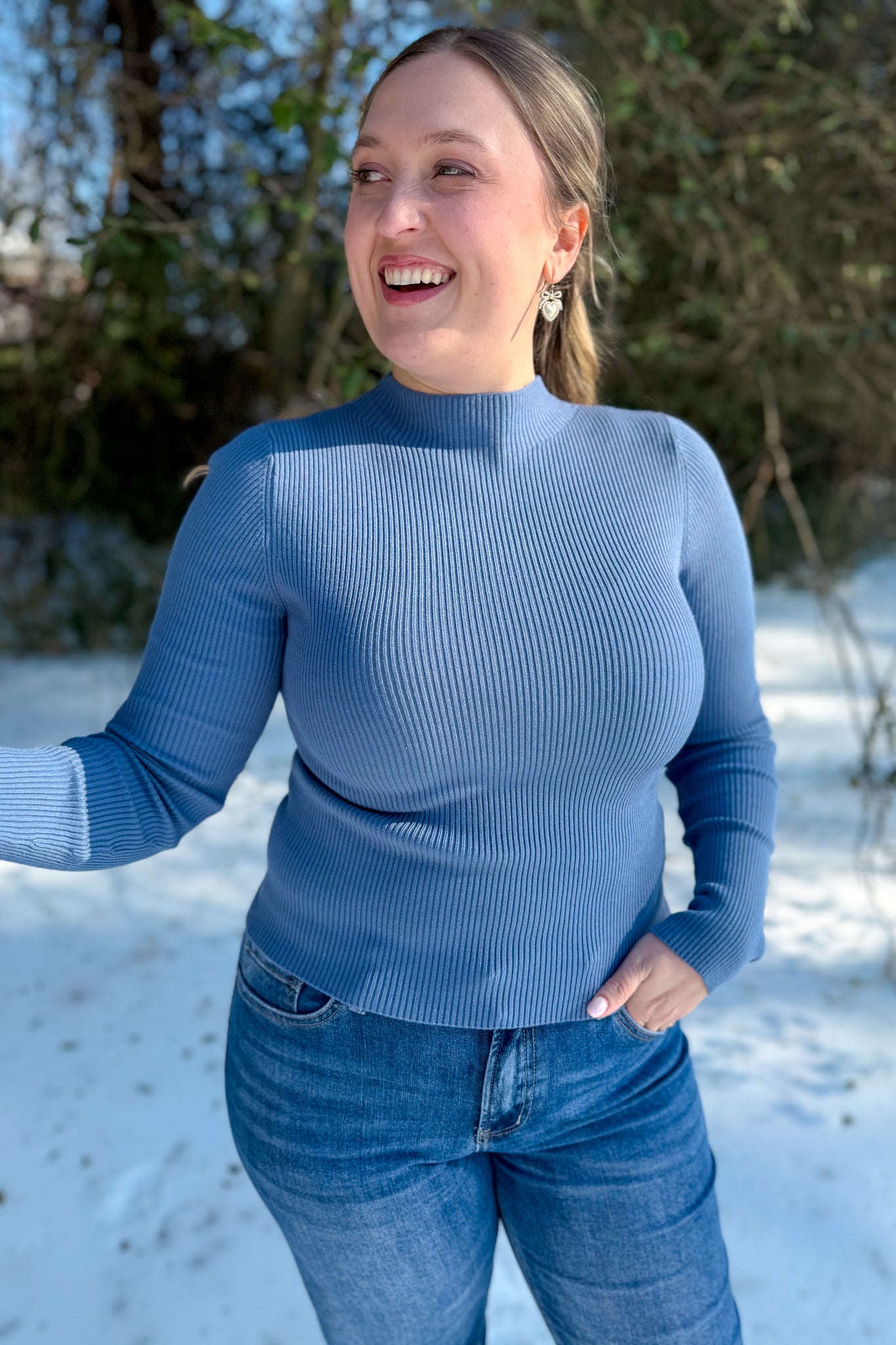This steel blue mockneck top is the perfect layering or stand alone piece!