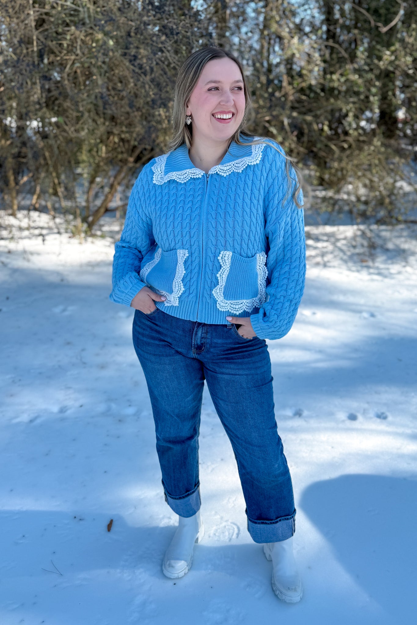 Blue lightweight knit jacket with lace Peter Pan collar and lace pocket outlines with zipper full body view