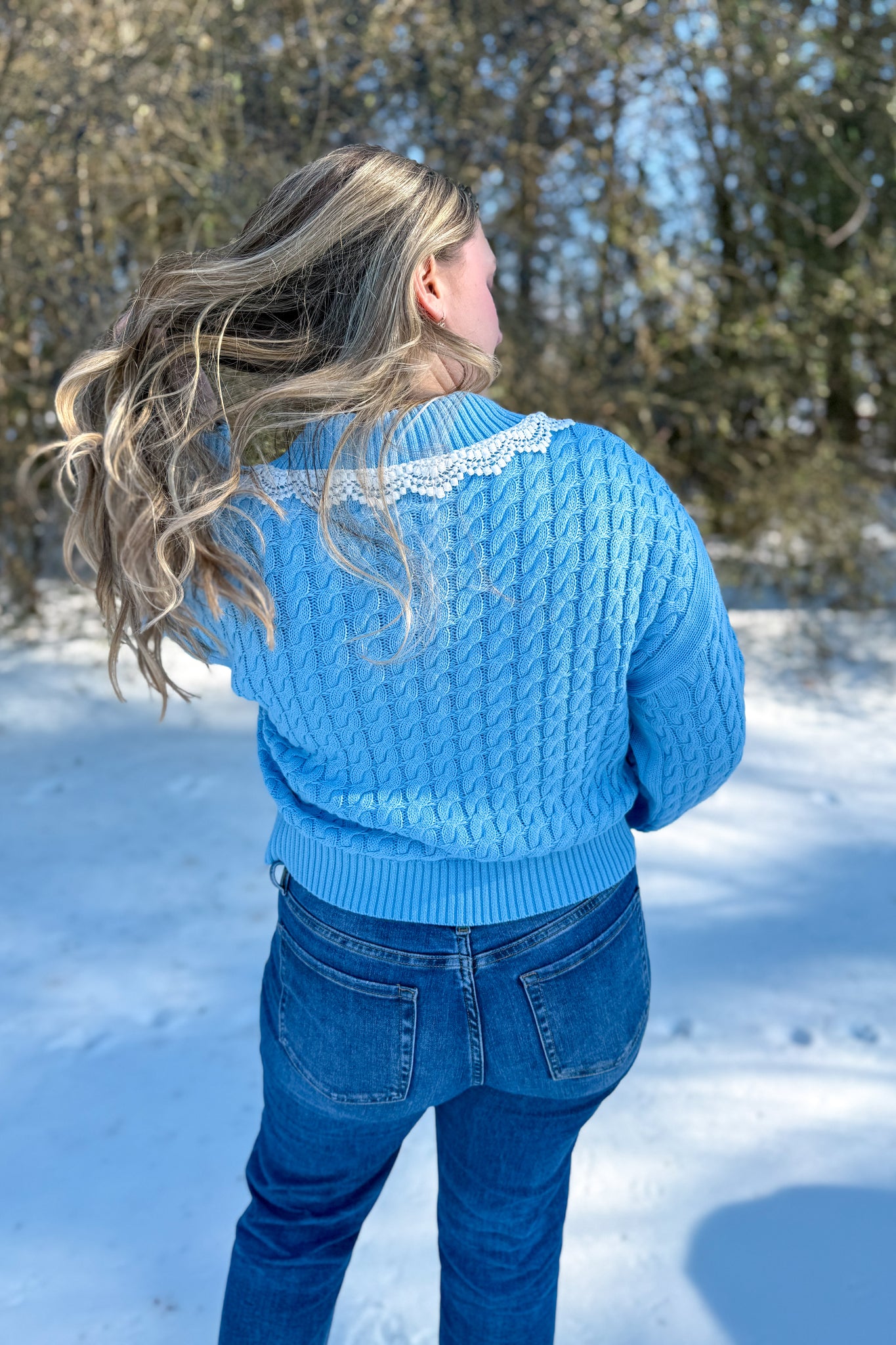 Blue lightweight knit jacket with lace Peter Pan collar and lace pocket outlines with zipper back view