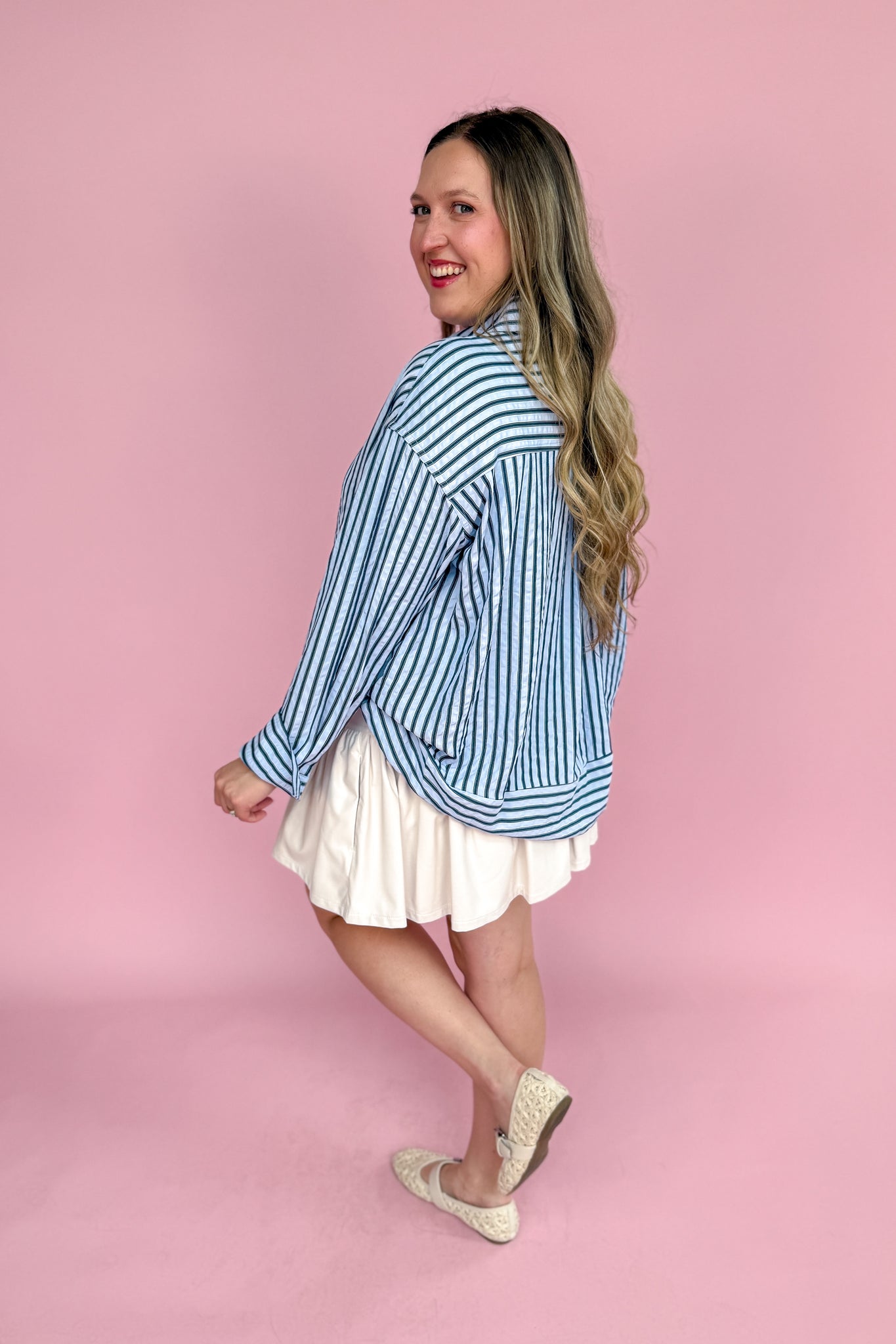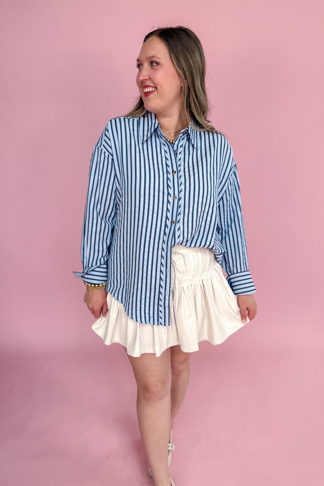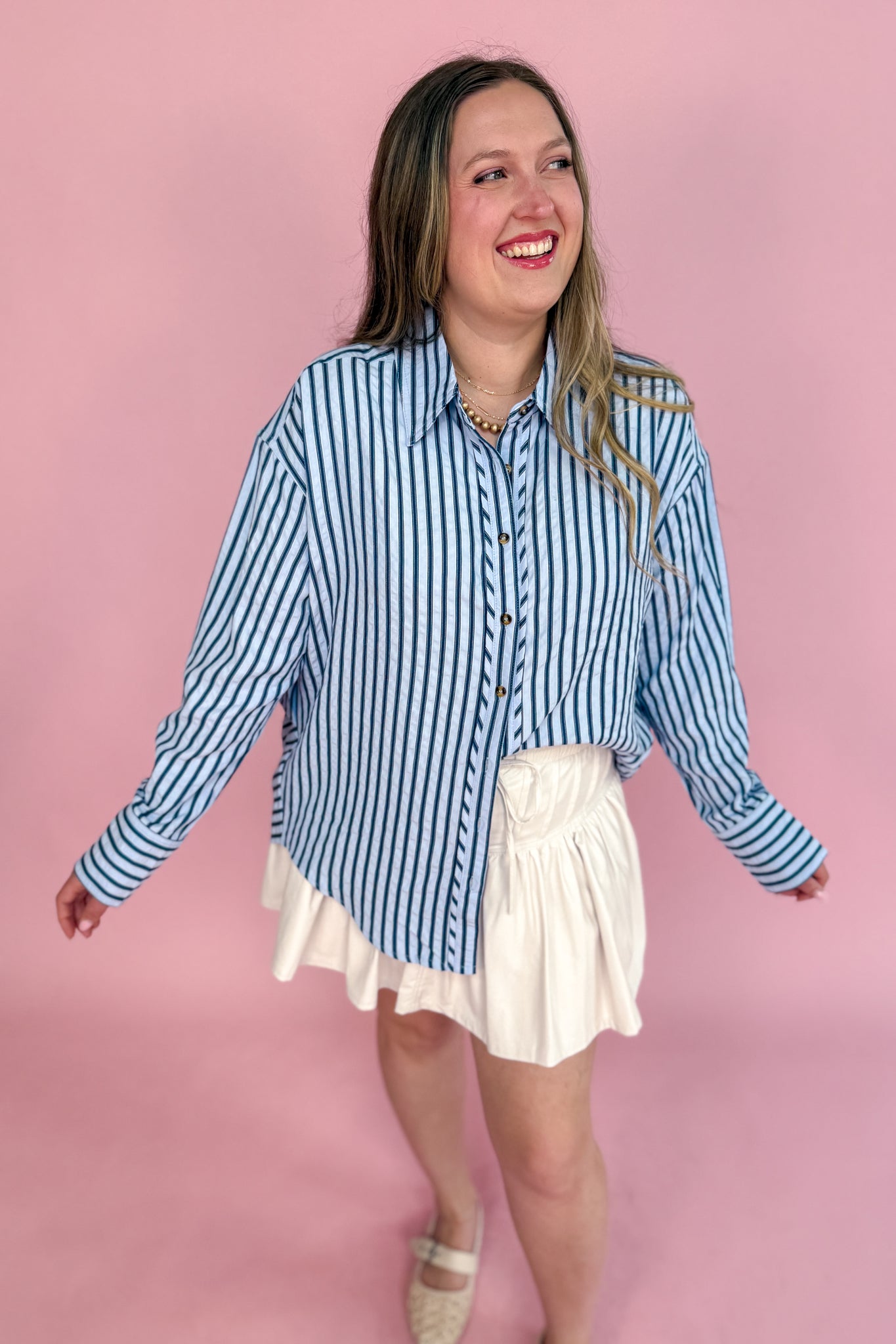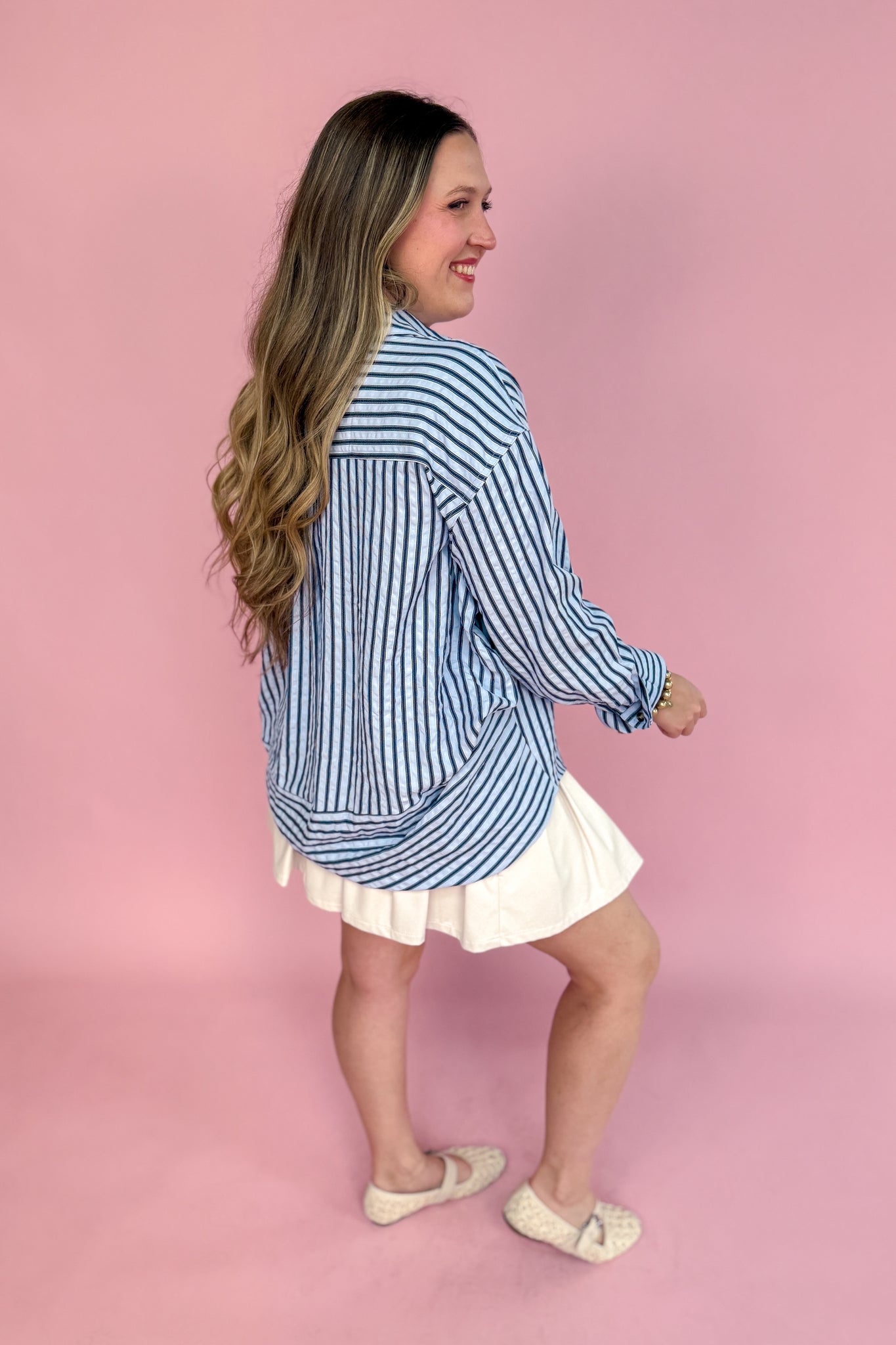 Add a dash of charm to your wardrobe with the Andrea Top! This lightweight, woven shirt features playful navy stripes against a soft light blue background. Enjoy classic button-down style with a twist—its textured stripes and unique pleated drape hem at the back offer a fun, flirty flair. Unlined and breathable, it’s perfect for layering or wearing solo on sunny days. Step out in style and let your outfit do the talking!