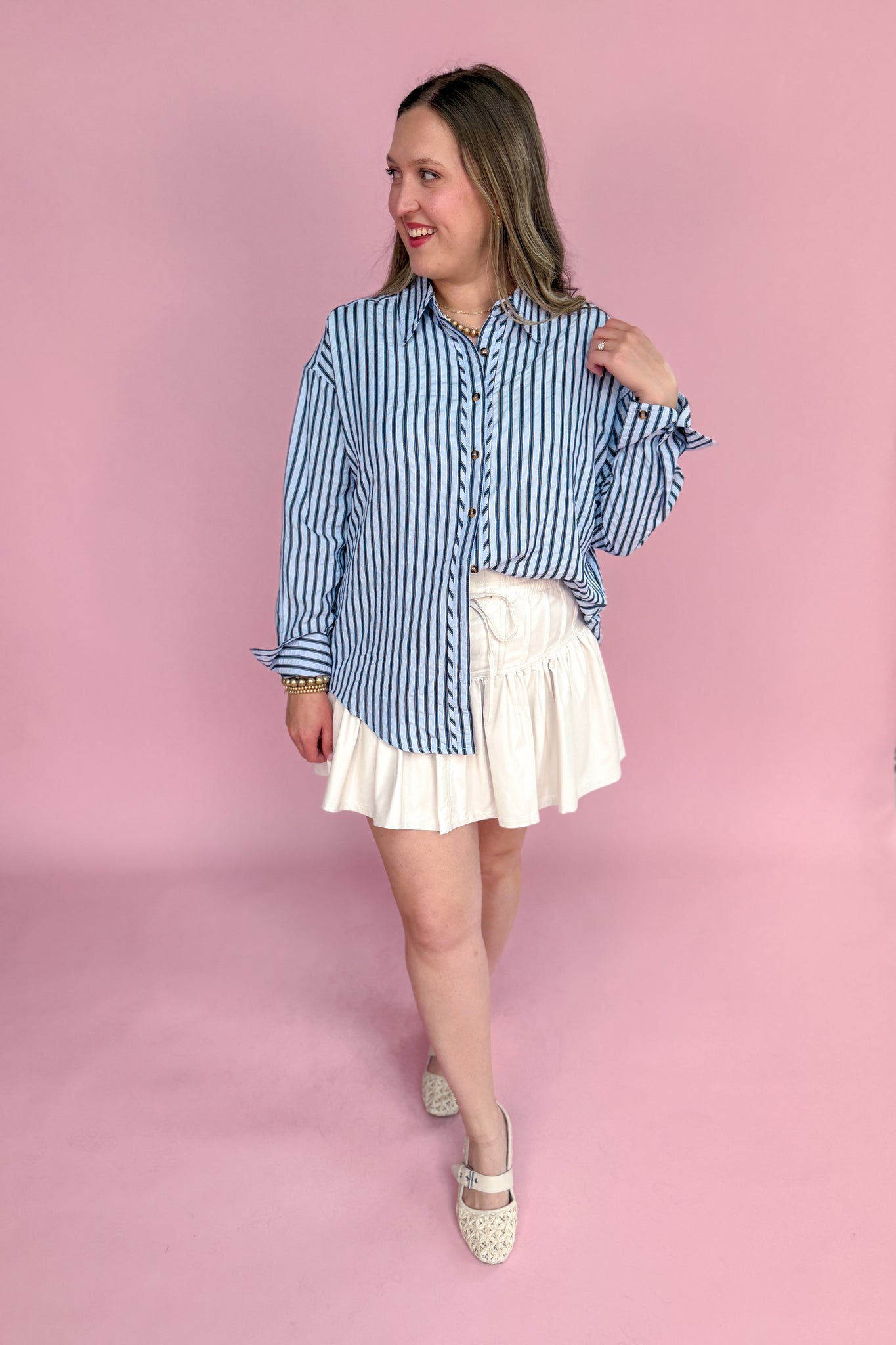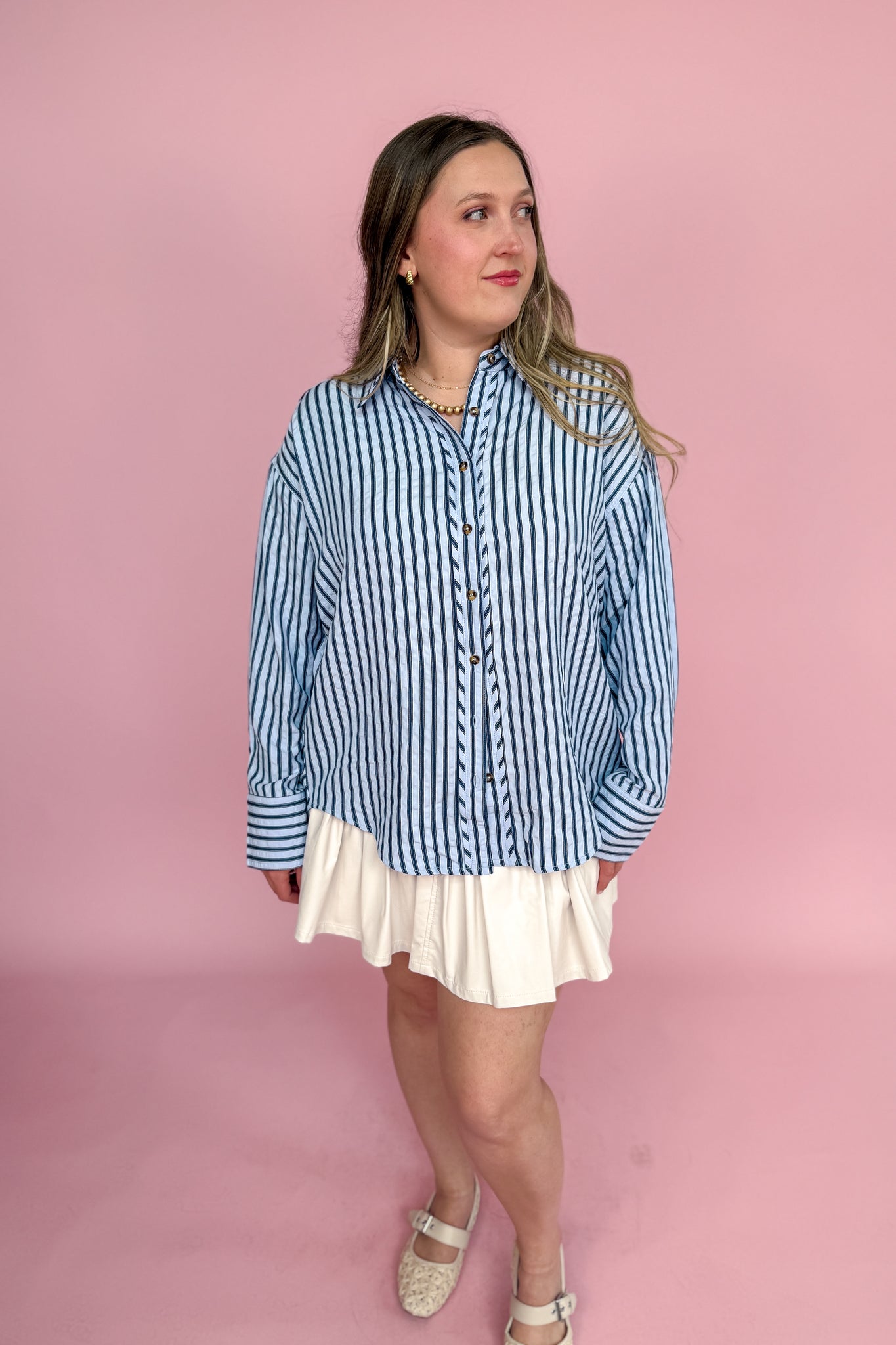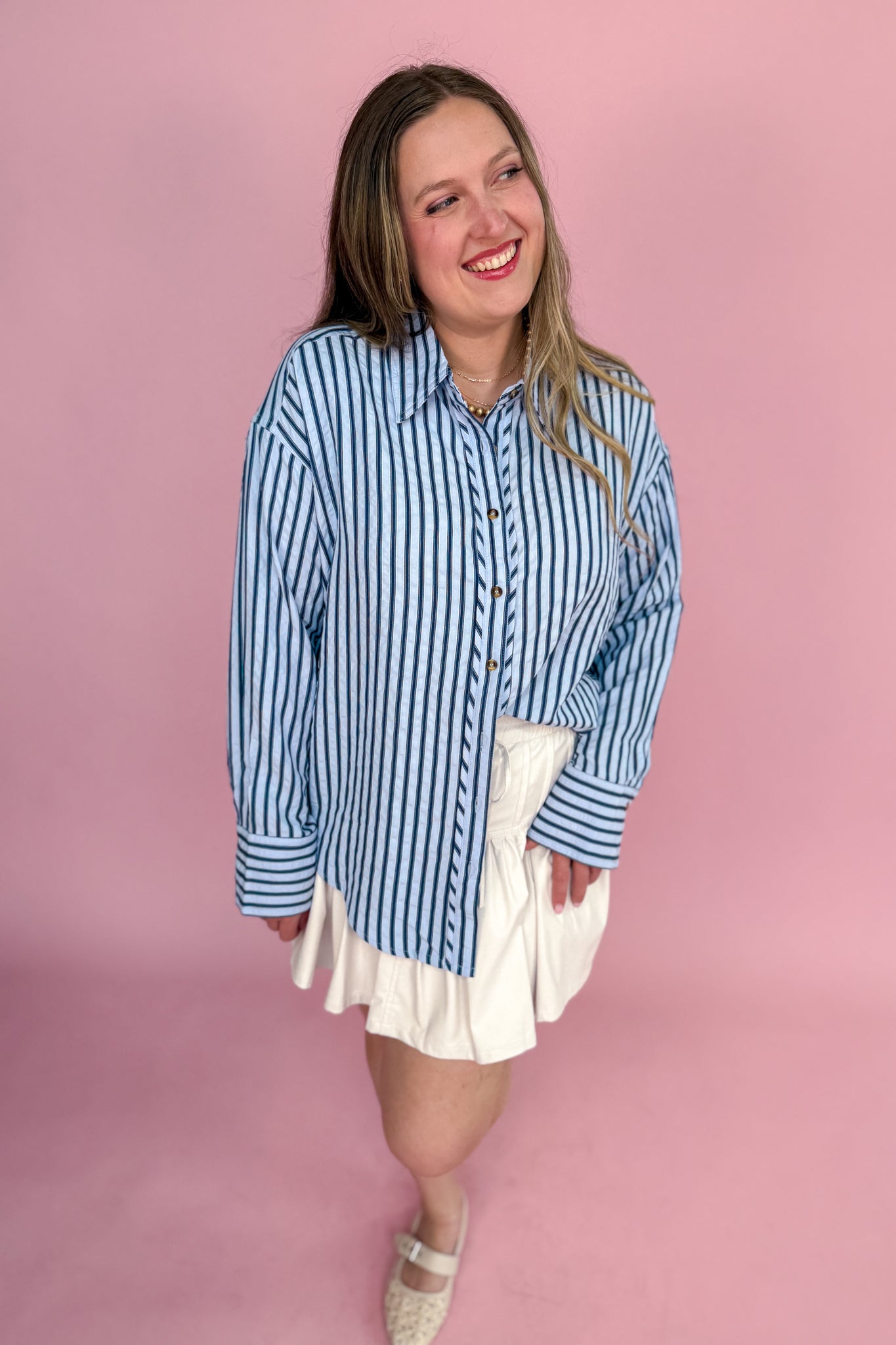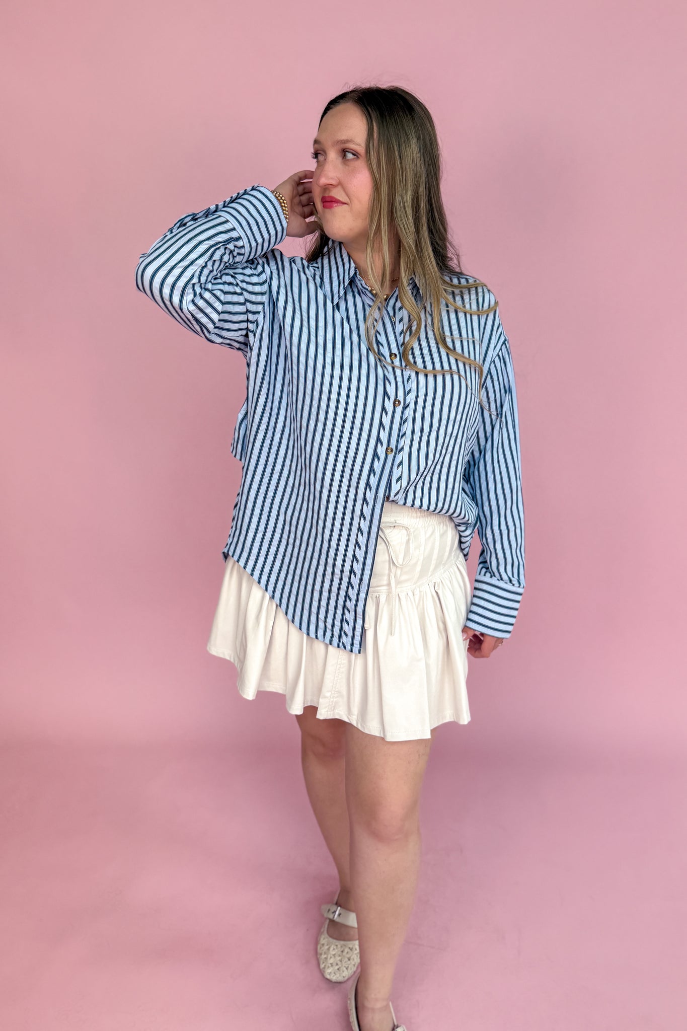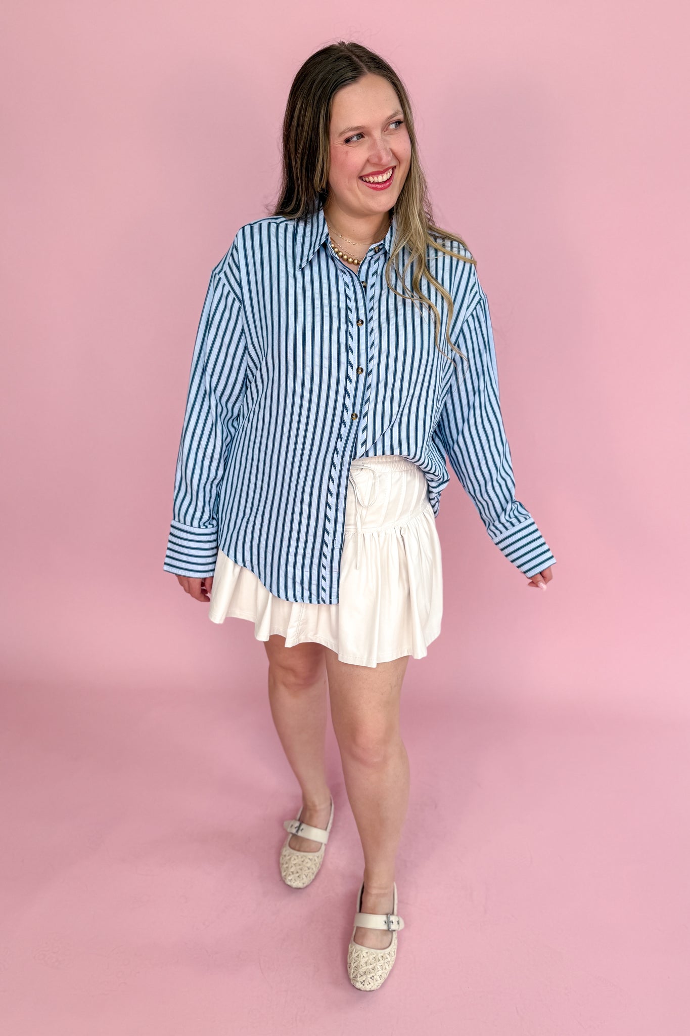 Add a dash of charm to your wardrobe with the Andrea Top! This lightweight, woven shirt features playful navy stripes against a soft light blue background. Enjoy classic button-down style with a twist—its textured stripes and unique pleated drape hem at the back offer a fun, flirty flair. Unlined and breathable, it’s perfect for layering or wearing solo on sunny days. Step out in style and let your outfit do the talking!