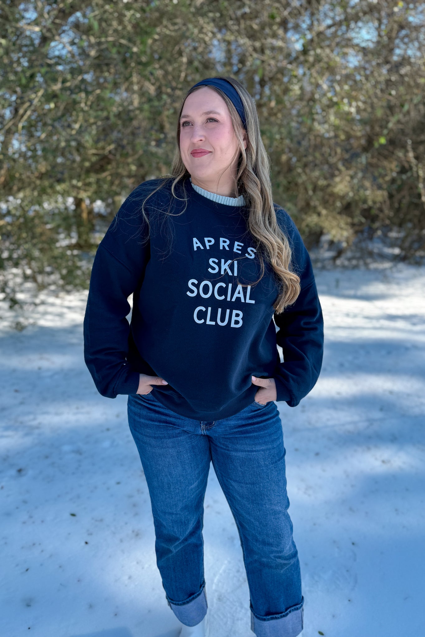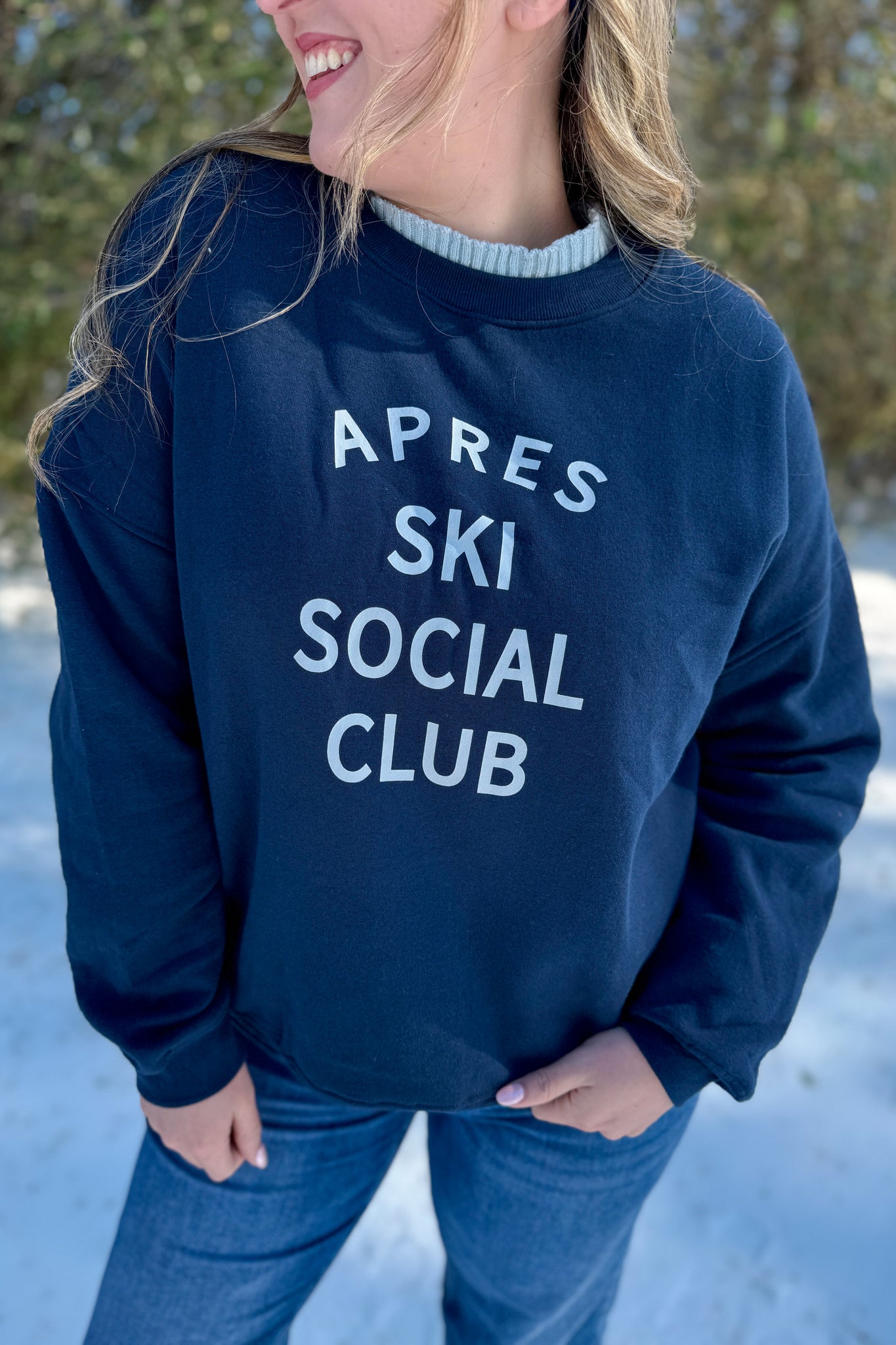 Join the club in the Aprés Social Club Sweatshirt. This navy sweatshirt features a bold white graphic, perfect for standing out on the slopes or cozying up by the fire. Stay stylish and warm with this must-have piece. Cheers to aprés!