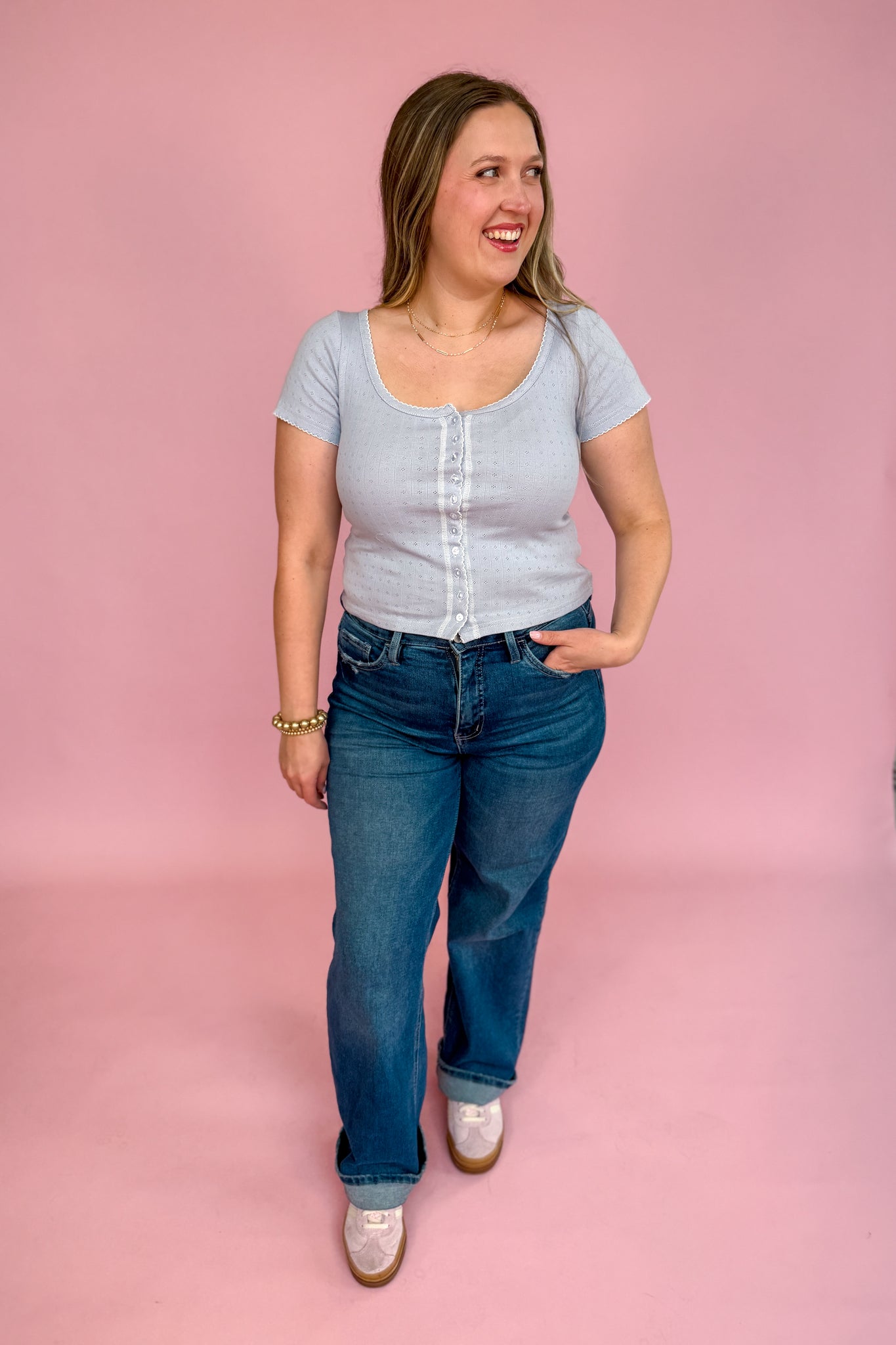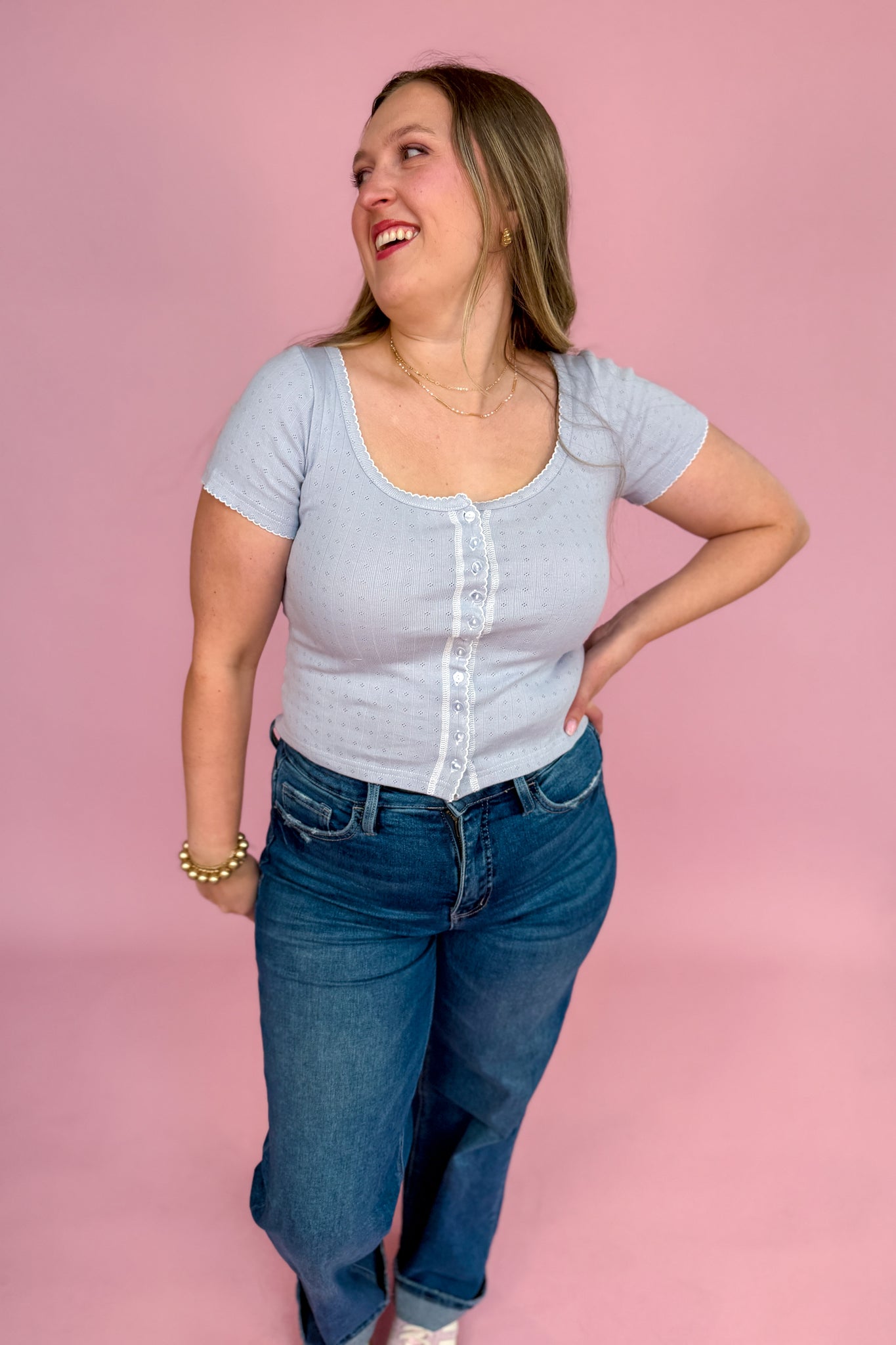 The Paisley Top in dusty blue is a playful and charming piece featuring a scoop neck with scallop embroidery detail. Its pointelle rib fabric and cap sleeves offer a light, airy feel, while the cropped cut adds a fun, flirty edge. Perfect for adding a splash of color and style to your casual wardrobe.